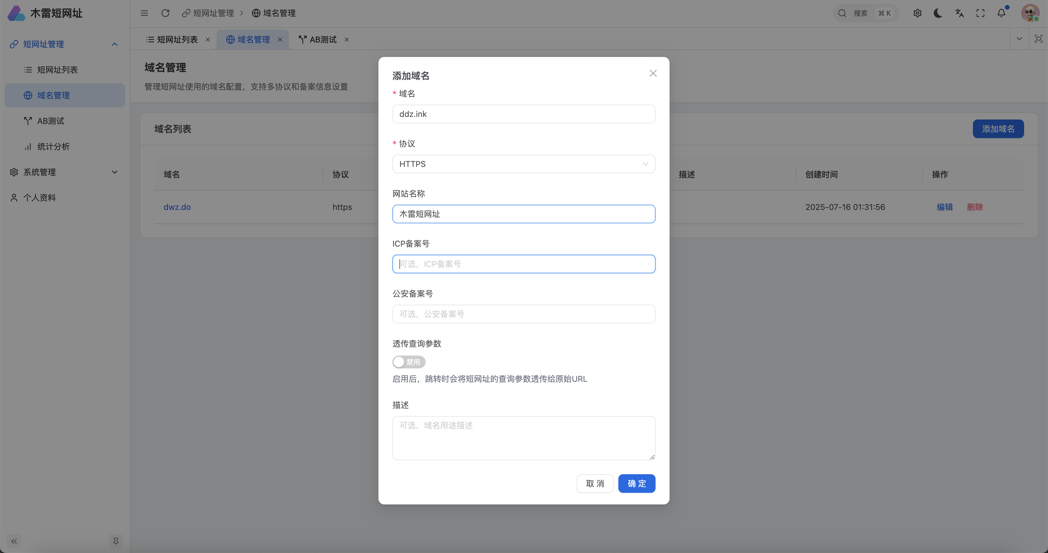 多域名支持: 支持配置多个短链接域名,灵活管理
