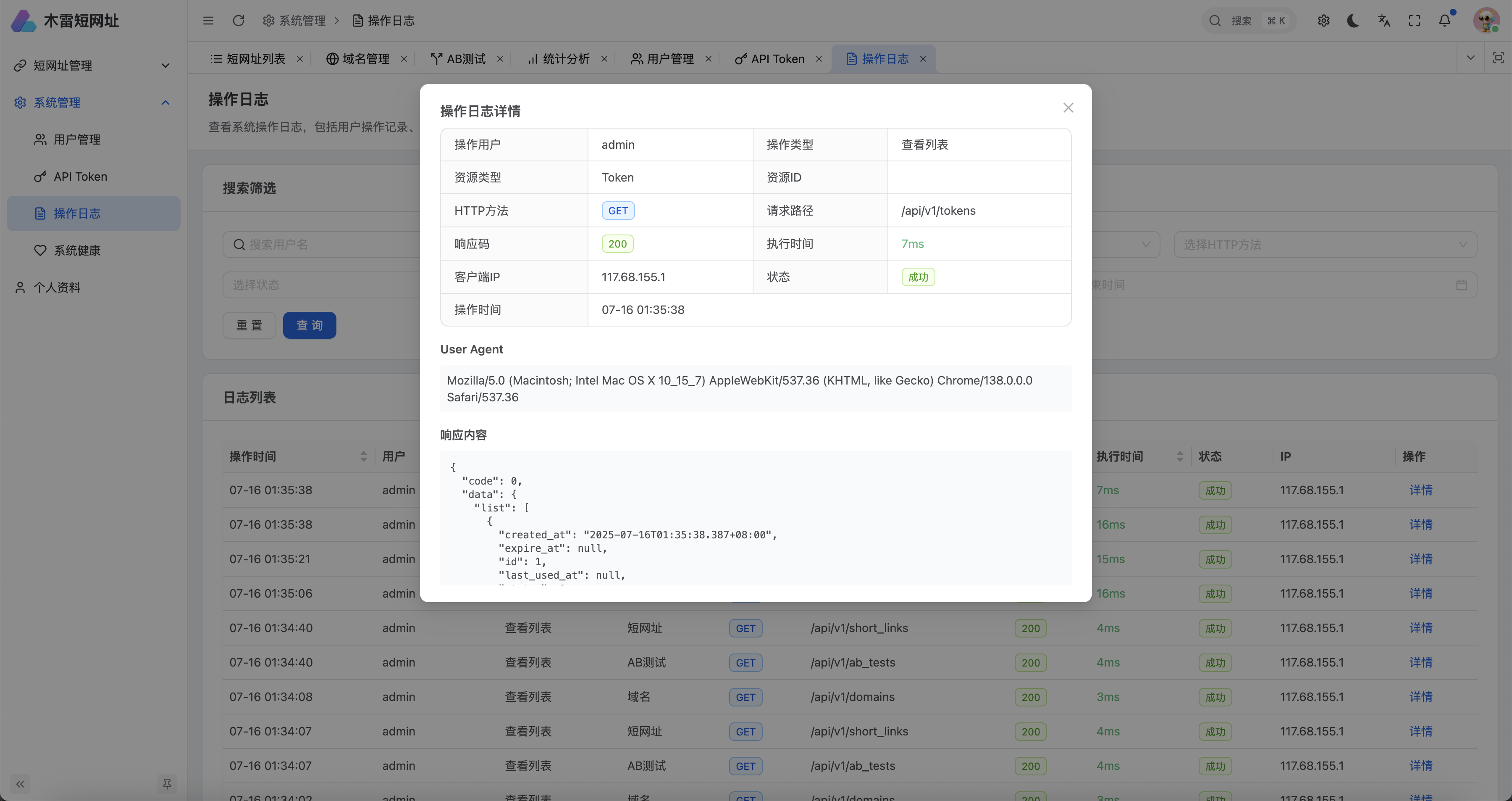 # 创建短链接POST /api/v1/short_links { "original_url": "https://example.com", "domain": "short.ly", "custom_code": "abc123"}# 获取短链接列表GET /api/v1/short_links?page=1&page_size=10# 获取短链接详情GET /api/v1/short_links/{id}# 更新短链接PUT /api/v1/short_links/{id}# 删除短链接DELETE /api/v1/short_links/{id}