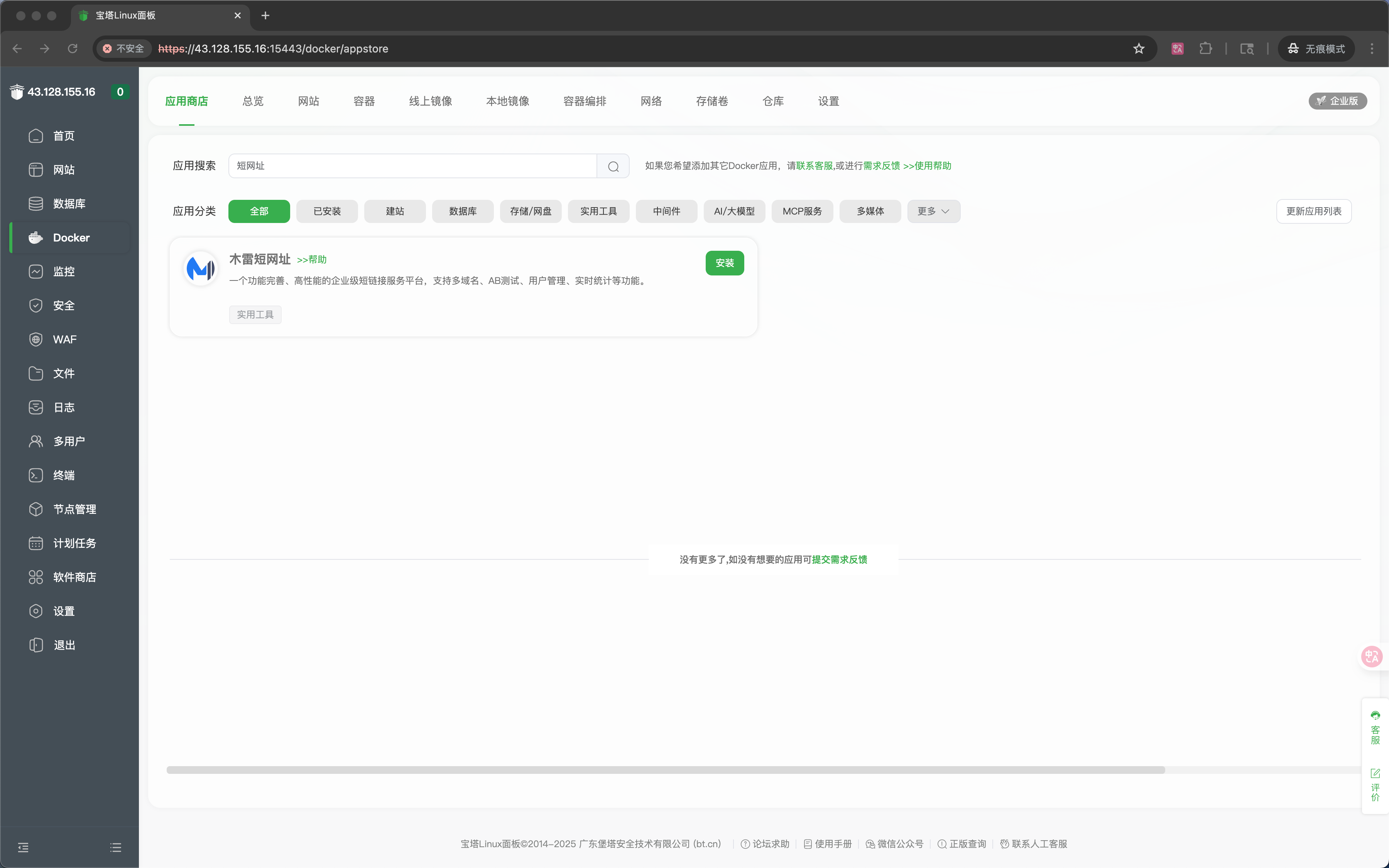 进入宝塔面板,点击【Docker】-> 【应用商店】-> 【应用搜索】-> 输入【短网址】-> 选择【木雷短网址】后面的【安装】