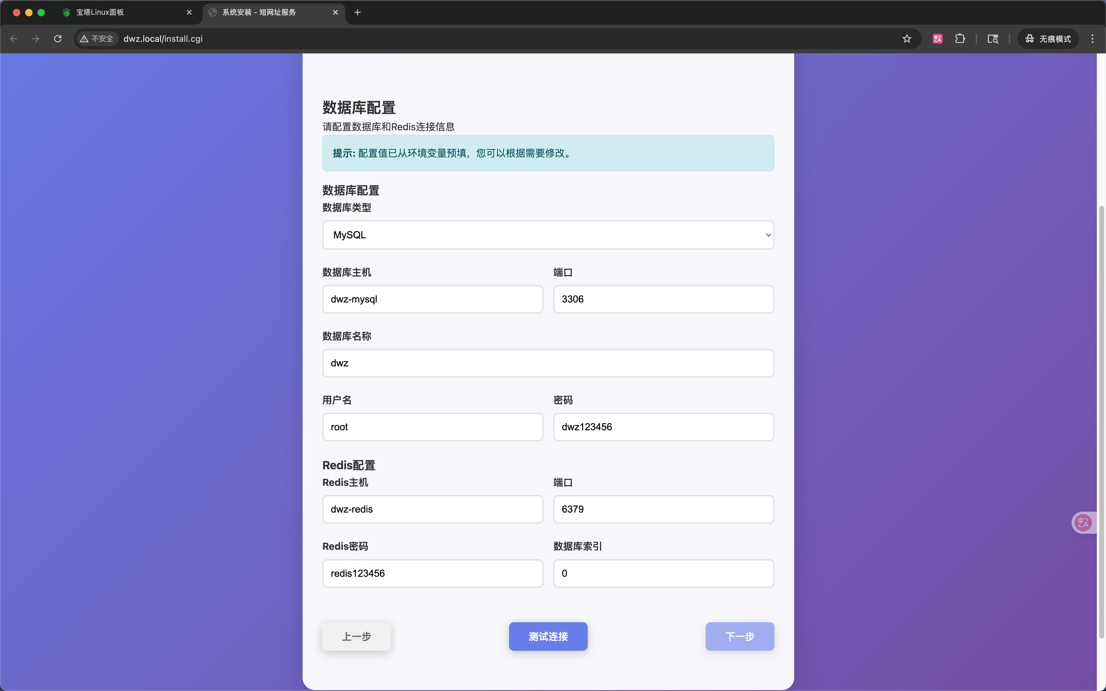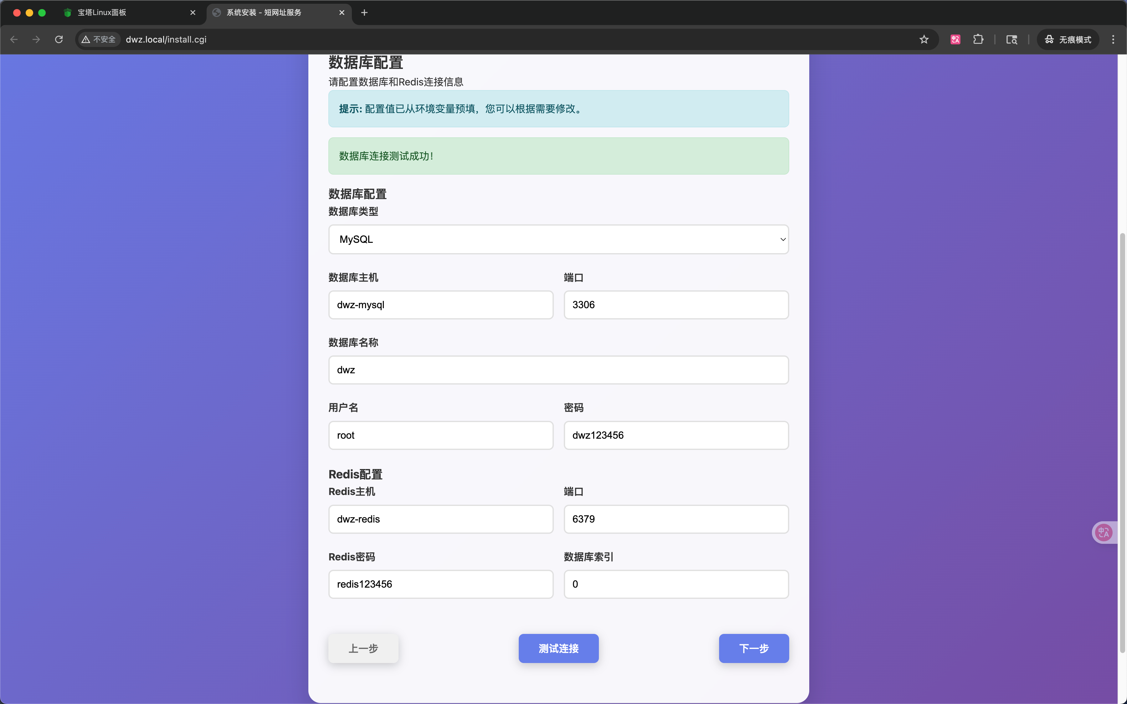 这里的信息,宝塔已经为您预填好了。一般情况不需要修改,直接点击最下面的【测试链接】没有问题的话【下一步】按钮会高亮,并点击【下一步】