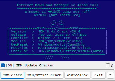IDM 6.4x by Ali.Dbg 是一款小巧的激活工具(仅0.1 MB),用于激活 Internet Download Manager、Windows 7、8、10 和 11 操作系统以及从2016到2024年的 Office 套件。最初,它只是一个针对常规 IDM(Internet Download Manager)软件的补丁程序。但随着最近的更新,作者 Ali.Dbg 添加了对 WinRAR、Windows 和 Office 的支持工具(灵感来源于 MAS:Massgravel)。此外,新加入的 WinToolBox 工具箱(来自 ChrisTitusTech)让用户能够简化安装过程、通过微调卸载软件、解决配置问题,并修复当前和未来的 Windows 更新中的问题。